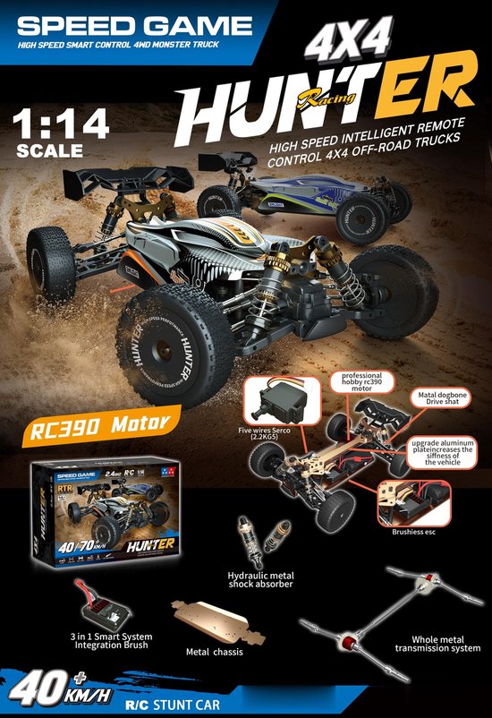 - Ervaar ultieme snelheid en controle met de HUNTER Racing RC Auto 1:14! Deze 4×4 offroad monster truck haalt snelheden tot 40 km/u dankzij de krachtige brushless motor en 2.4GHz afstandsbediening.