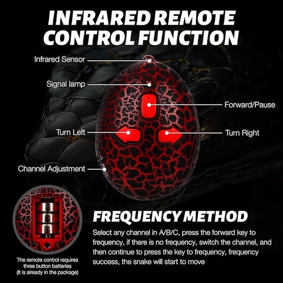 De meegeleverde slangenei-afstandsbediening maakt het mogelijk om de slang eenvoudig te laten kruipen in alle richtingen. Met een bereik tot 15 meter is dit RC speelgoed ideaal voor binnenspellen, grapjes met vrienden of interactie met huisdieren.