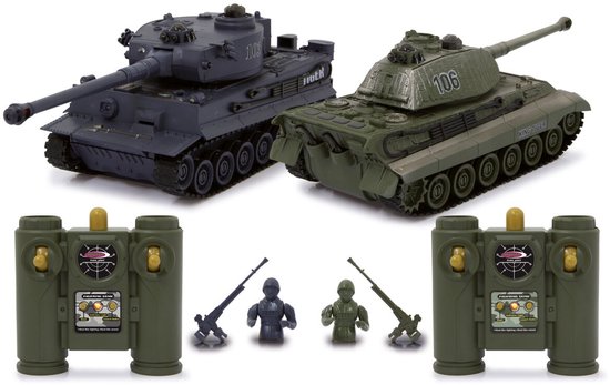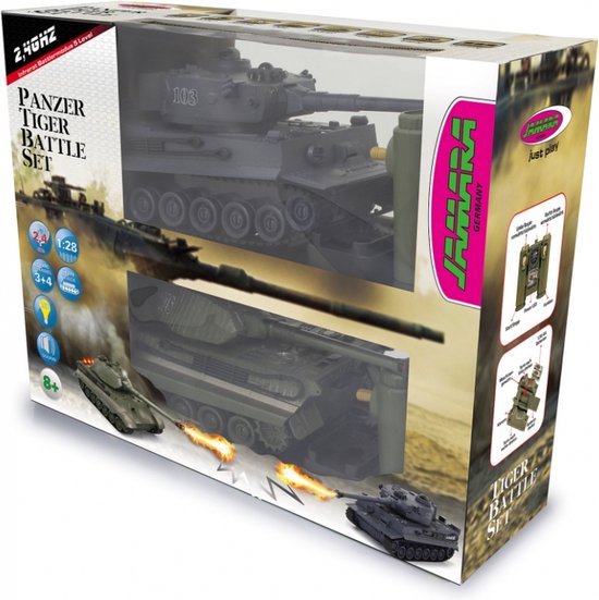 Jamara RC Panzer Tiger Battle Set 1:28 - Radiografisch bestuurbare tankMet de RC Panzer Tiger Battle Set van Jamara beleef je spannende tankgevechten! Deze radiografisch bestuurbare tank is uitgerust met een 2,4GHz besturing, waardoor je samen met vrienden tot wel zes tanks tegelijk kunt laten strijden. Dankzij de demomodus kun je direct genieten van een voorgeprogrammeerde show, terwijl de tank extreem wendbaar is en zelfs over obstakels kan klimmen.De Panzer Tiger is gemaakt van stevig kunststof en heeft een stoere multicolor uitstraling. Het realistische design en de indrukwekkende prestaties zorgen voor urenlang speelplezier, zowel binnen als buiten. Laat je fantasie de vrije loop en ga de strijd aan in je eigen tankgevecht!Extra informatieRadiografisch bestuurbare tank met 2,4GHz voor multiplayerDemomodus met voorgeprogrammeerde actiesExtreem wendbaar en hoge klimvaardigheidGeschikt voor kinderen vanaf 3 jaar.