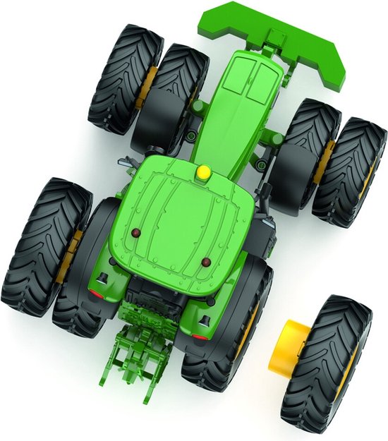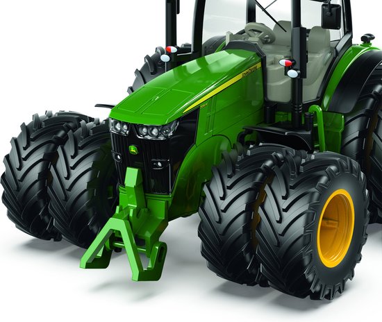 De John Deere 7920R tractor met dubbele banden is via de Siku app (bluetooth) of een afstandsbediening te besturen. De rubberen banden zijn door het magnetisch contact makkelijk te wisselen.