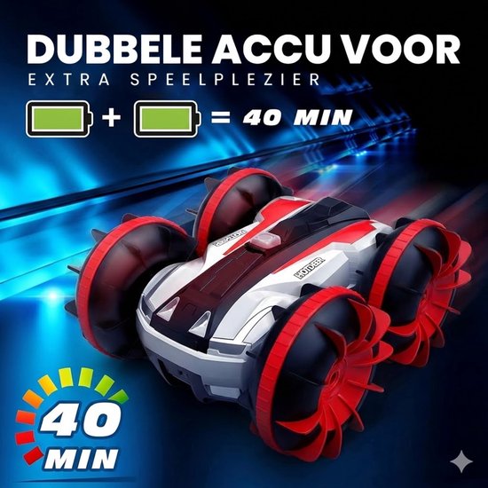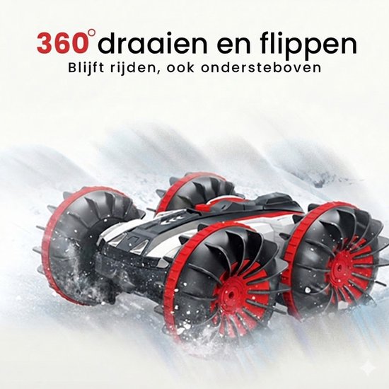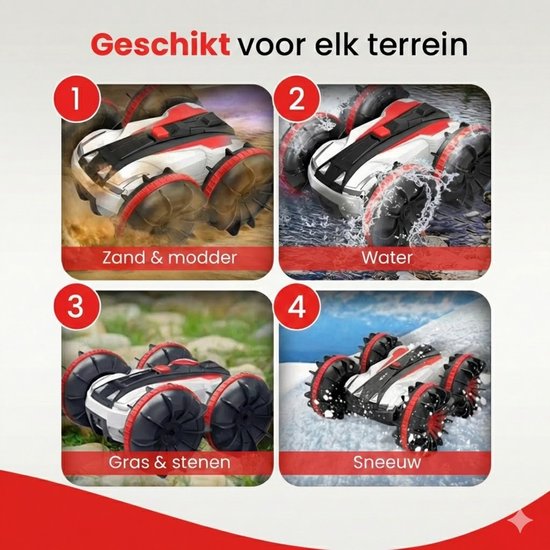 De meeste rc auto's stoppen bij een plas. Deze niet. Het volledig waterdichte design maakt van deze bestuurbare auto ook een bestuurbare boot. Gewoon het water in, en weer terug op het droge. Ideaal voor buiten spelen bij elk weer.
