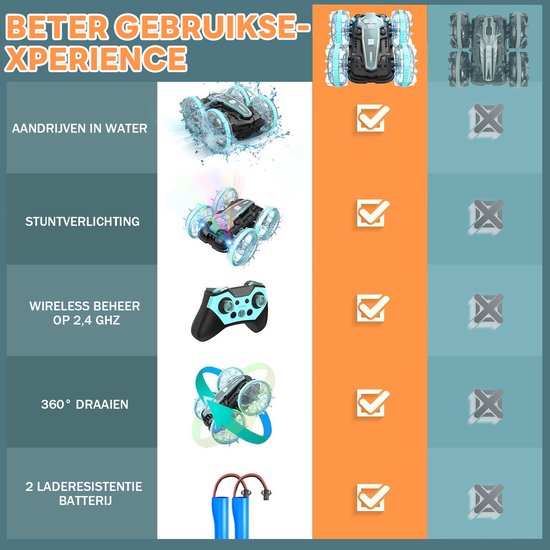 Zand, gras of zelfs water? Deze robuuste bestuurbare auto trotseert het allemaal moeiteloos. Dankzij zijn stevige, waterdichte constructie én twee verwisselbare wielopties is deze afstandsbestuurbare Auto perfect voor elk terrein. Zo geef je je kind de ultieme speelervaring, zonder frustraties of limieten – lees snel verder!