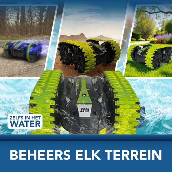 Deze robuuste all-terrain RC auto rijdt moeiteloos over gras, zand, modder en water. Dankzij het waterdichte ontwerp en de stevige constructie blijft de auto stabiel op uiteenlopende ondergronden. Met normale wielen of rupsbanden geniet je van optimale grip en controle tijdens elk avontuur
