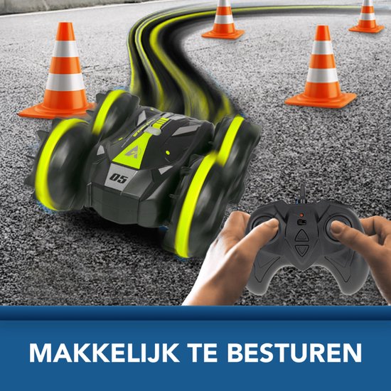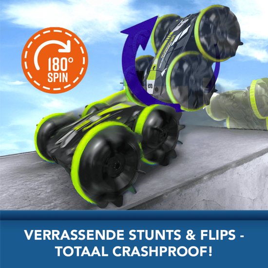 De auto voert 360° spins en 180° flips uit en kan op beide zijden blijven rijden. Met een topsnelheid van 15 km/u biedt hij dynamisch speelplezier voor kinderen vanaf 3 jaar. De 2.4GHz afstandsbediening zorgt voor een stabiele verbinding tot 100 meter op land en 35 meter op water, waardoor meerdere auto’s tegelijk bestuurbaar zijn zonder onderlinge interferentie.