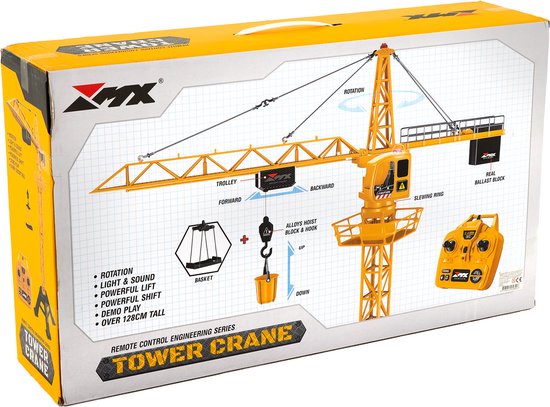 Bestuurbare Hijskraan RC, 128cm. Deze indrukwekkende kraan werkt via een adapter, terwijl de draadloze controller op 2 AA-batterijen werkt.