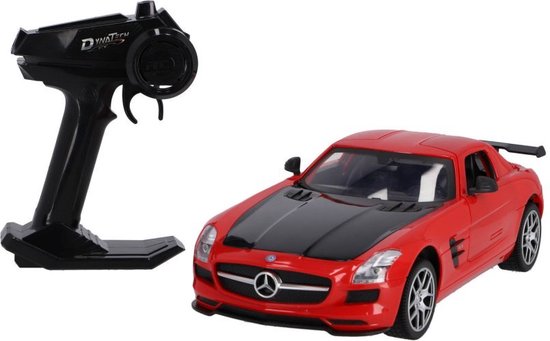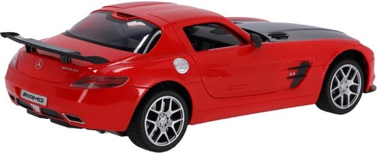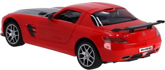 RC rood-zwarte Mercedes-Benz SLS AMG GT Final Edition op schaal van 1:14. Max snelheid 12 km/u. 30 meter bereik. Deuren kunnen open. 2.4 GHZ. Geschikt voor kinderen vanaf 3 jaar.