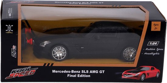 Race het huis rond met deze supergave zwarte Mercedes-Benz SLS AMG GT Final Edition! De auto met werkende koplampen heeft een afstandsbediening waarmee je met een afstand van 10 meter de auto kan besturen. De radiografisch bestuurbare auto kan vooruit, achteruit, links en rechts rijden. De auto is op een schaal van 1:24 en heeft alle details van het origineel zoals zijn matte lak en hoogglans zwart gespoten accenten. De auto heeft rubberen banden en je kunt er zowel binnen als buiten mee rijden. De auto werkt op 2x AA-batterijen, deze zijn niet meegeleverd.