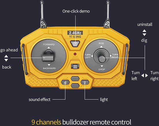9-kanaals bediening – graven, duwen, draaien, lichten en geluid aan/uit