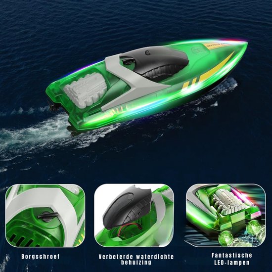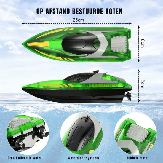 Laat kinderen het water veroveren met de bestuurbare boot Groen. Met een krachtige 130 motor, snelheden tot 15 km/u en een stabiel 2.4G signaal is dit het perfecte speelgoed voor snelheid, avontuur en competitie.