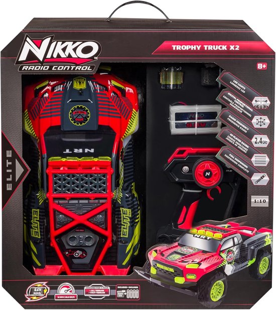 De Nikko Trophy Truck X2 is een offroad-monster. Met een krachtige 360°-aandrijfmotor hebben deze machines veel vermogen. Deze trucks rijden met een sterke, lichtgewicht carrosserie, een volledig geveerde ophanging met stuurstang en een stalen achterdifferentieel. Dankzij de volledig digitale proportionele gas- en stuurinrichting kunt u de precisie rechtstreeks vanaf de afstandsbediening aanpassen met behulp van de trimregelaar.