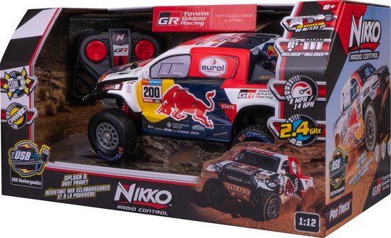 Maak kennis met de Nikko RC Pro Truck – een officiële replica van de Toyota Gazoo Racing Dakar 2023 winnaar. Deze high-performance off-road racetruck combineert snelheid, kracht en realisme. Met een lengte van 33 cm, een topsnelheid van 14 km/u en krachtige 4WD-aandrijving is deze truck klaar om elk terrein te domineren. Dankzij de 6,4V Li-ion accu en USB-C snellader ben je binnen 90 minuten weer klaar om te racen. Het robuuste chassis, volledige vering en noppenbanden zorgen voor ultieme grip en stabiliteit – zelfs op modder, zand en grind!