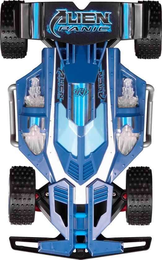 De Alien Panic is een krachtige RC buggy met schaal 1:18 en een lengte van 23 cm. Hij haalt een topsnelheid van 8 km/u en biedt een speeltijd tot 60 minuten (afhankelijk van batterijen en gebruik). De afstandsbediening werkt op 2,4 GHz en biedt volledige controle: vooruit, achteruit, links en rechts. Dankzij de sterke zendtechnologie kun je tot 10 voertuigen tegelijk besturen zonder storingen, met een bereik tot 40 meter. De buggy heeft robuuste off-road banden voor extra grip en LED-verlichting voor racen in het donker. Batterijen zijn niet inbegrepen (4x AA voor voertuig, 3x AAA voor controller). Inclusief standaard Nikko fabrieksgarantie van 2 jaar. Geschikt voor kinderen vanaf 6 jaar – ideaal voor spannende off-road avonturen!