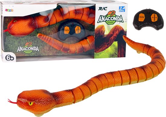 De slang is oranje van kleur met expressieve strepen, kenmerkend voor de anaconda. Intrekbare tong en draaiende torso. Opladen gaat via USB. Het grote voordeel is afstandsbediening met behulp van een afstandsbediening van 2,4 G. De rechterknop biedt handmatige bediening en de linker - automatisch. De slang kruipt heen en weer en verandert van richting van links naar rechts.