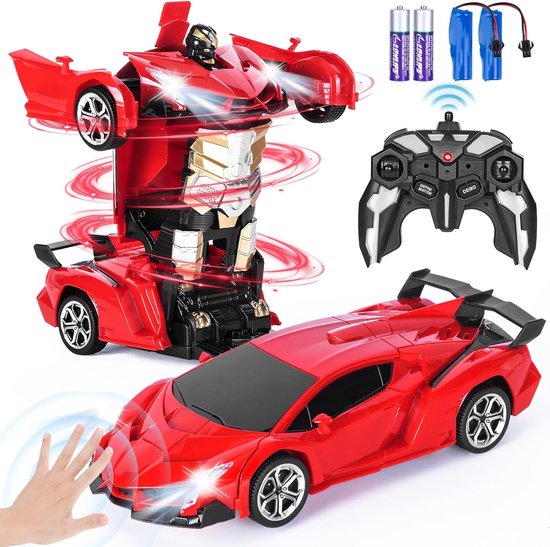 Uitgebreide functies en anti-interferentie: coole koplampen, realistische muziek en geluidseffect, 2,4 GHz anti-interferentie afstandsbediening maakt een flexibele bediening vooruit/achteruit/links/rechts, complete 360°-rotatie in zowel de robot- als de automodus, gebarenherkenning, vervorming, afstandsbediening met één-knopsvervorming of automatische demonstratie. Snellere responstijden, een bereik van maximaal 50 meter en de mogelijkheid om 2 of meer robot-RC-auto's tegelijkertijd te spelen zonder je te storen