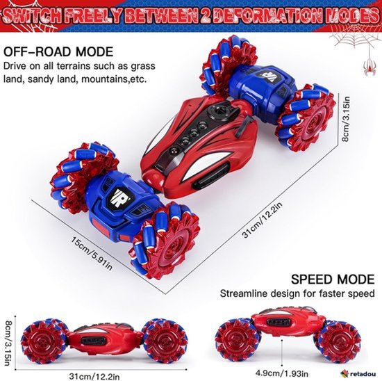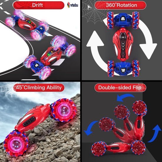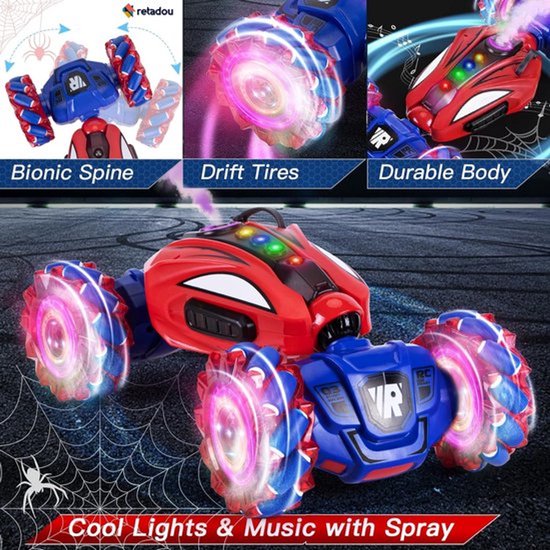 Op afstand bestuurde auto, 4 x 4 Spider, handgestuurde stuntauto met sproeien, muziek en licht, 2,4 GHz, 360° rotatie, drift RC-autospeelgoed vanaf 6, 7, 8, 9, 10 jaar, voor jongens en