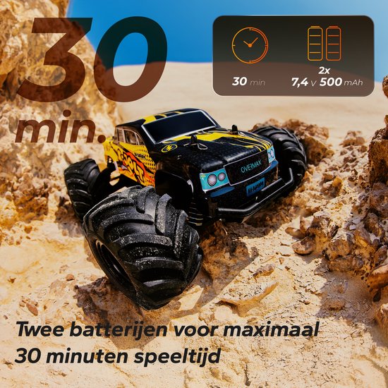 Bij de RC-auto krijg je twee Li-ion-accu’s voor tot 30 minuten rijden zonder op te laden. Is één accu leeg, dan wissel je snel naar de tweede en rijd je meteen verder.