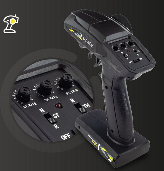 Verassende motor Een krachtige elektromotor met koellichaam zorgt voor maximaal vermogen in combinatie met een laag energieverbruik. Dankzij speciale oplossingen raakt de motor niet oververhit en verliest hij nooit vermogen. Versterkte metalen 4x4 aandrijving Snelle start, grip op alle ondergronden, gemakkelijk sturen en bijna verticale beklimmingen overwinnen. Dit alles is mogelijk met de X-pace 4x4 rallyauto. De metalen aandrijfset zorgt voor een uitstekende duurzaamheid en onder andere de versterkte aandrijfcomponenten. het differentieel, de as en de naven maken de auto onverslaanbaar op elk circuit. Effectieve LED-verlichting Val op op elk circuit! X-pace is uitgerust met een set LED-diodes, die elke wedstrijdrit nog effectiever maken. Dit maakt de auto leuk, ook in het donker. Comfortabele en nauwkeurige controller met trimmers Eenvoudige raceroutes zijn geen uitdaging meer? X-pace biedt geweldig entertainment, zelfs tijdens de meest geavanceerde rally's met scherpe bochten! Dankzij de trimmers in de controller heb je de mogelijkheid om het vermogensniveau en de draai eenvoudig aan te passen aan je vaardigheden. Bovendien zorgen ze voor een uitstekende controle over de auto en zijn snelheid. Of de bestuurder nu rechts- of linkshandig is, u kunt nu vrijelijk van stuurhand wisselen. Dit type controller geeft een nauwkeurige controle en reageert direct op bewegingen. TUV-certificaat Onze op afstand bestuurbare voertuigen zijn goedgekeurd door de beste en gerenommeerde onderzoeksinstelling in Europa - TUV. Geteste producten worden grondig getest op veiligheids- en kwaliteitseisen. Het ideale cadeau