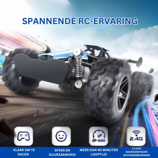 Geavanceerde functies voor optimale prestaties: De 2,4 GHz afstandsbedieningstechnologie maakt het mogelijk om de auto vanaf een afstand van maximaal 40 meter te besturen, waardoor je nauwkeurige controle hebt, zelfs bij hogere snelheden. Of je nu over zand, gras of hobbelige paden rijdt, de robuste composietbanden en de vering aan zowel de voor- als achterkant zorgen voor een stabiele en vloeiende rit.
