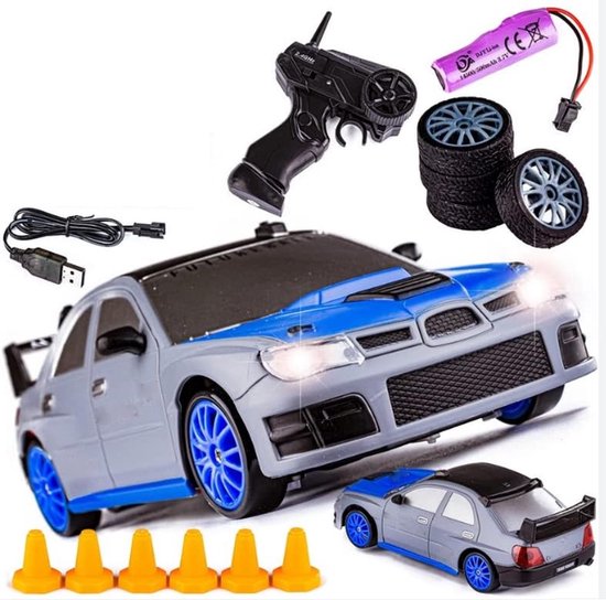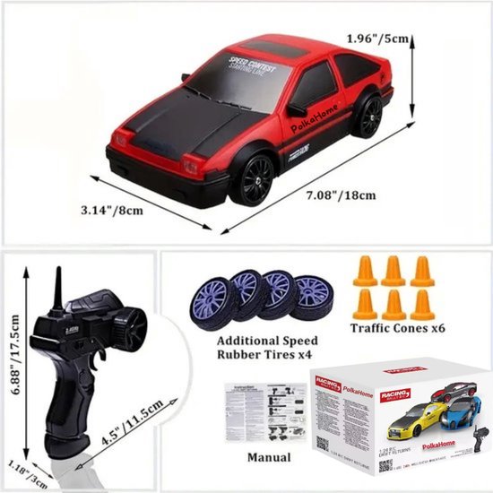 De RC Drift Car wordt geleverd met alles wat je nodig hebt om direct te beginnen: 4 racebanden, 4 driftbanden, een 3.7V 500mAh oplaadbare batterij, een USB-oplaadkabel, en 6 verkeerskegels voor extra rijplezier. Let op: de afstandsbediening vereist twee AA-batterijen (niet inbegrepen).