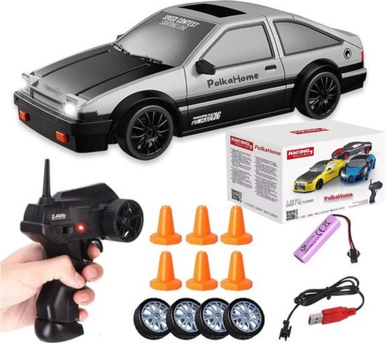 De RC Drift Car wordt geleverd met alles wat je nodig hebt om direct aan de slag te gaan: 4 racebanden, 4 driftbanden, een 3.7V 500mAh oplaadbare batterij, een USB-oplaadkabel, en 6 verkeerskegels voor extra rijplezier. Let op: de afstandsbediening vereist twee AA-batterijen (niet inbegrepen).