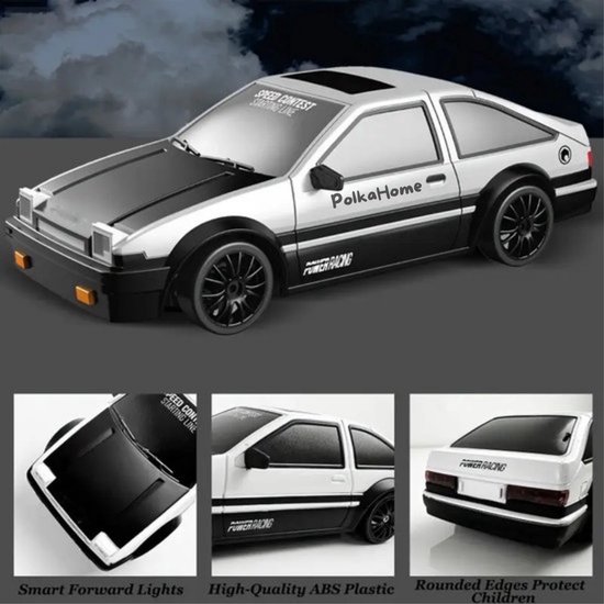 De RC drift auto heeft een coole en robuuste uitstraling, gebaseerd op een verbeterde versie van een klassieke sportwagen. De buitenkant is gemaakt van hoogwaardig PVC, dat zowel flexibel als duurzaam is, zodat de auto bestand is tegen stoten en botsingen. De heldere koplampen zorgen ervoor dat je de auto gemakkelijk kunt vinden en besturen, zelfs in het donker.