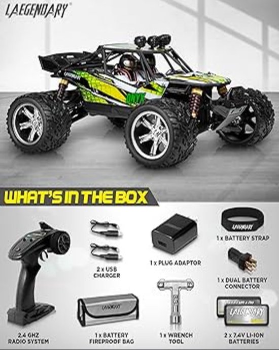 SET BEVAT - Deze RC-auto wordt geleverd met een vuurvaste powerbag, afstandsbediening, moersleutelgereedschap, 2 USB-opladers, en een batterijstekker, riem en connector.