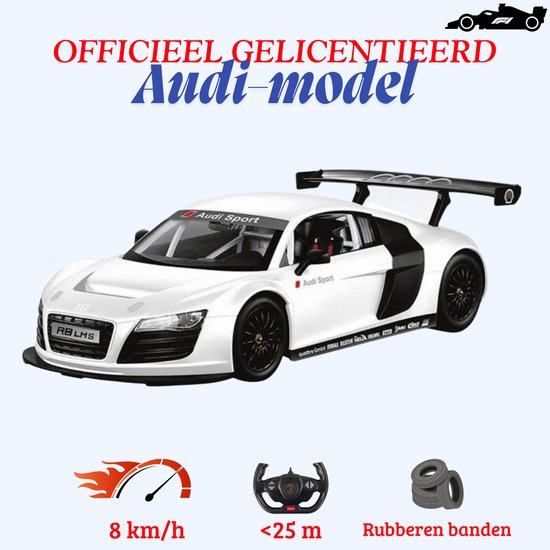 Rastar Audi R8 1:18 RC Auto Wit – RC Auto - Luxe Afstandsbestuurbare Sportwagen met Realistische Details, Rubberen Banden & Precisiebediening – Duurzaam Model voor Kinderen & Volwassenen – Met Ebook