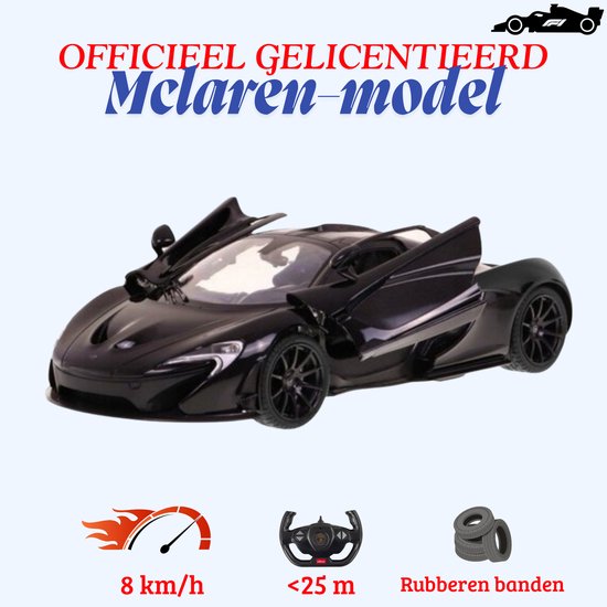 Rastar McLaren P1 1:14 Zwarte RC Auto – Bestuurbare Auto - RC Auto - Afstandsbediening Sportwagen met LED Verlichting, Rubberen Banden, Realistisch Interieur, 2.4GHz, Schokdemping en Snelheid tot 9 km/u – Luxe Speelgoedauto voor Kinderen – Met Ebook