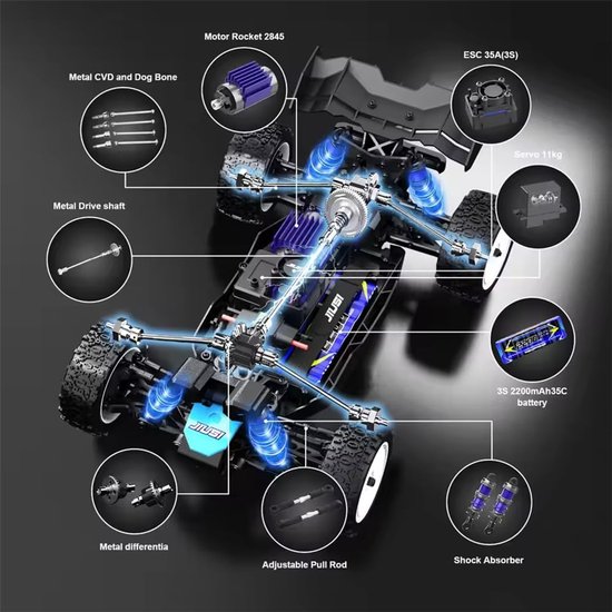 - Krachtige 3S borstelloze 3600KV motor – levert snelle acceleratie en veel kracht, perfect voor races en ruig terrein.