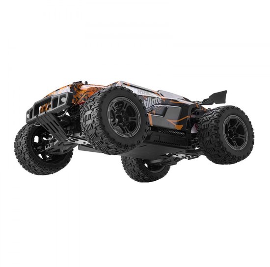 Stabiele stunts: wheeliebar, 45° stuurhoek en precieze servo Behoud controle bij wheelies en scherpe bochten. De wheeliebar stabiliseert bij hard optrekken, terwijl de grote stuurhoek en nauwkeurige servo voor wendbaarheid zorgen. Hydraulische schokdempers dempen klappen op ruw terrein.