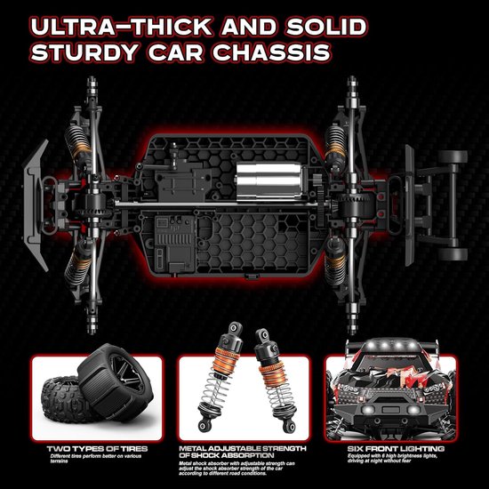 - IPX4 waterbestendig & LED-verlichting – Deze RC-auto kan tegen een spatje regen en blijft ook ’s avonds goed zichtbaar dankzij zes heldere LED-lampen, zodat je dag en nacht kunt racen.