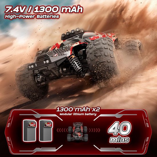 - Dubbele 7.4V 1300mAh Li-ion batterijen – Speel tot wel 40 minuten non-stop door eenvoudig van batterij te wisselen via het snelwisselsysteem. Veilig opladen dankzij ingebouwde bescherming tegen oververhitting en overstroom.