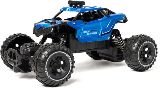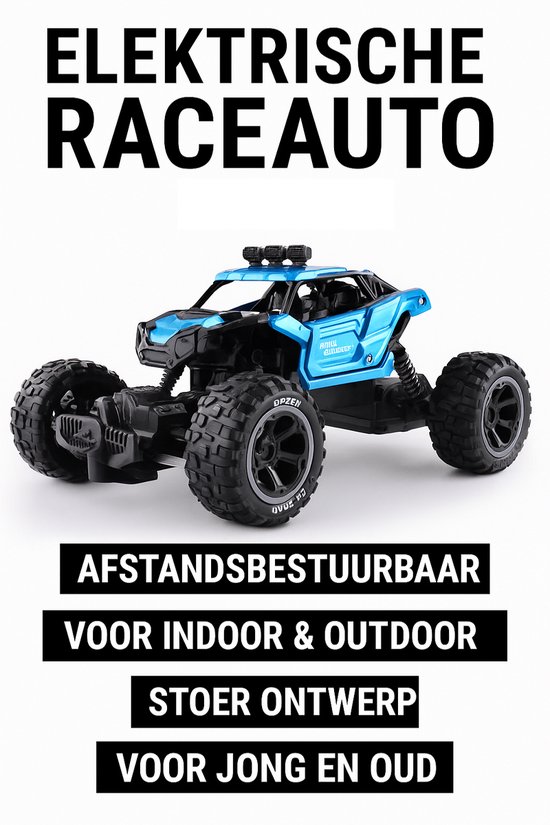 Compacte RC raceauto in blauw, geschikt voor binnen en buiten. Maximale snelheid 15 km per uur, bereik tot 50 meter, maximale batterijduur tot 2 uur. Geschikt vanaf 7 jaar.