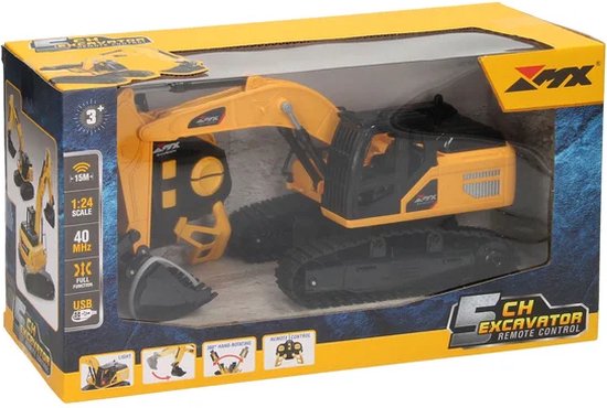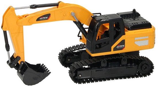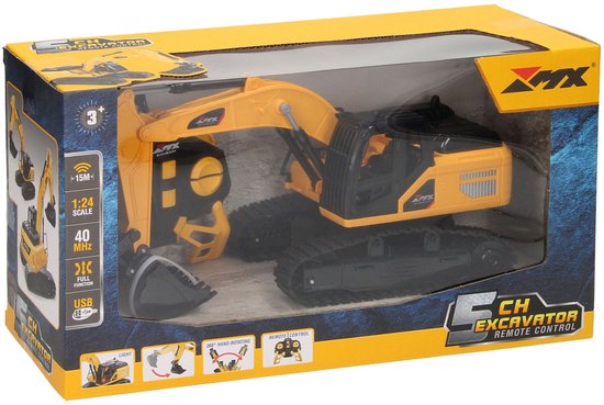 RC Graafmachine met rupsbanden en lichteffect. De graafmachine is 360 graden draaibaar en heeft een bereik een 15 meter. Afmetingen: 26 x 14 centimeter (in doos). Schaal 1:24. Exclusief batterijen (2xAA) voor de afstandsbediening. Geschikt vanaf 3 jaar.