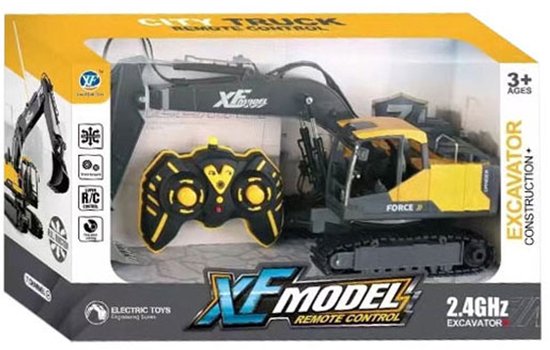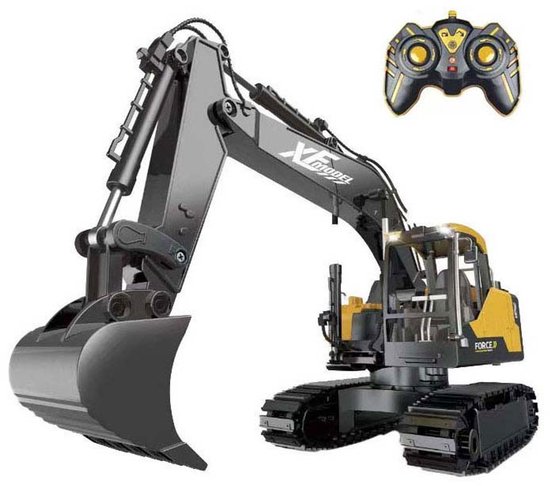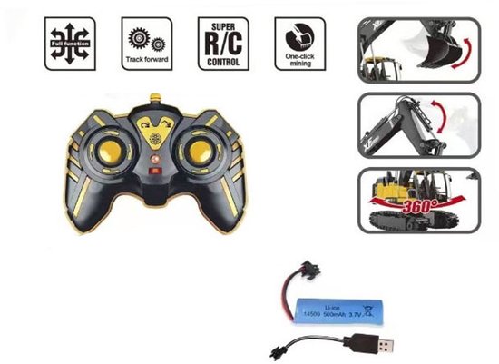RC Bestuurbare Graafmachine Rupsbanden. De graafmachine werkt op een accu (inbegrepen) en de controller op 2 AA batterijen (niet inbegrepen).Afmetingen: 40,5 x 12 x 27 centimeter. Geschikt vanaf 3 jaar.