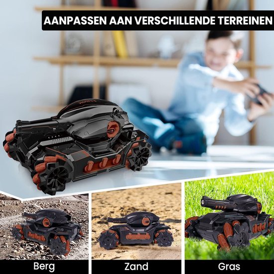 Multifunctionele bediening: RC + gebarenbediening, 360° rotatie, 180° rotatie van de toren, draaibare loop, multiplayer-ondersteuning, driften en stuntrijden.