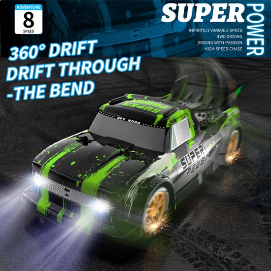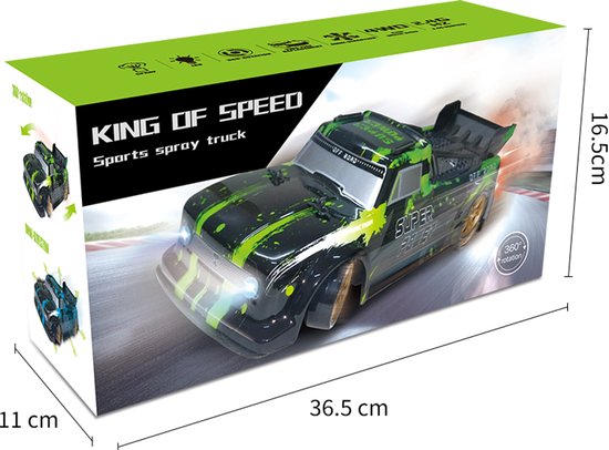 Stoere 4WD RC drift truck met unieke water spray functie voor realistische rookeffecten tijdens het driften. Groot formaat en sterke grip maken dit de perfecte auto voor binnen én buiten.