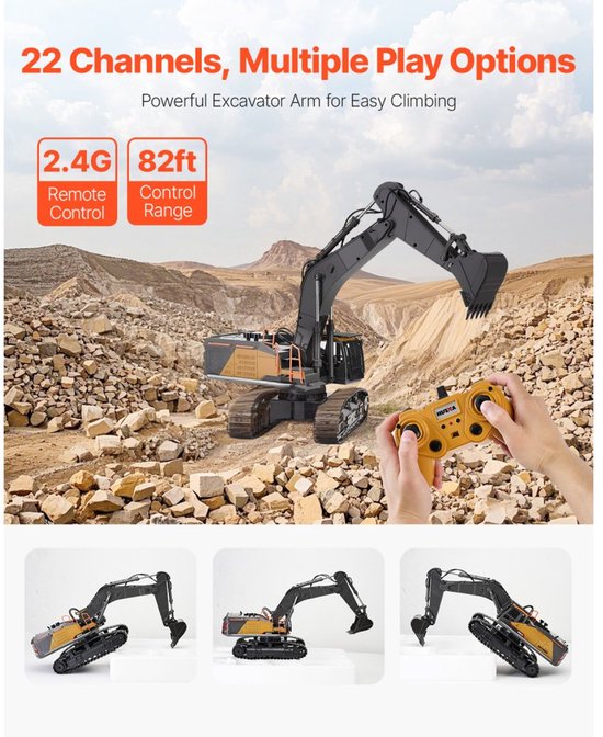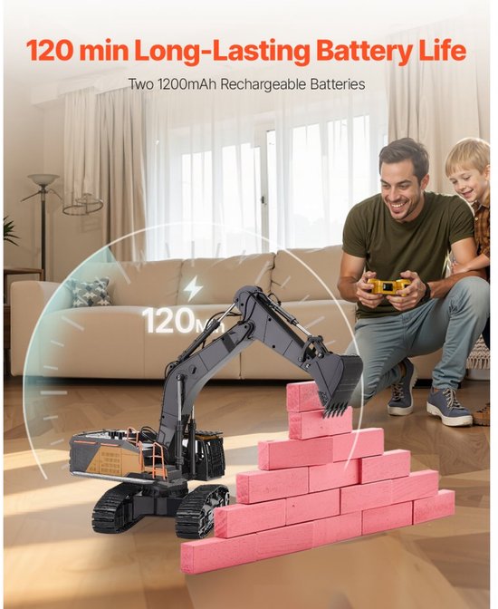 Krachtige RC-graafmachine op schaal 1:14 met metalen bak en lange speeltijd Deze realistische graafmachine combineert een solide constructie van ABS en metaal met nauwkeurige bediening. Met drie onafhankelijk aangedreven armen, sterke rubberen rupsbanden en een storingsvrije 2,4 GHz-afstandsbediening geniet je van realistisch graven, rijden en duwen – zowel binnen als buiten.