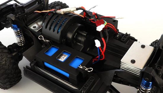 Duurzaam en klaar voor actie: Het stevige kunststof frame beschermt de auto tegen botsingen, terwijl de schokdempers met metalen veren zorgen voor een stabiele rit. Dankzij het spatwaterbestendige ontwerp kan jouw crawler tegen een stootje, wat hem ideaal maakt voor buitengebruik.