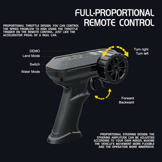 - Volledige proportionele besturing – Nauwkeurig sturen en snelheid regelen