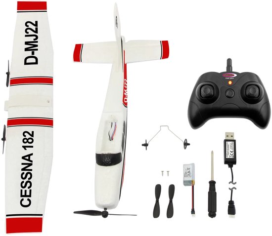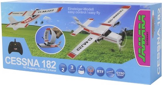 Altijd al eens met een op afstand bestuurbaar vliegtuig willen vliegen? Ben je altijd bang geweest dat alles kapot gaat na het vliegen? Wij kunnen deze angst van u wegnemen. Met de RC Cessna 182 met afstandsbediening van JAMARA gemaakt van flexibel microfoam kun je direct piloot worden. Het model kan in drie eenvoudige stappen in elkaar worden gezet, de accu opladen en wegrijden. Dankzij het ingebouwde gyrosysteem ligt het vliegtuig soepel en gelijkmatig in de lucht en vliegt het stabiel en veilig. Met de 2,4 GHz radiografische afstandsbediening heb je zelfs als beginner de volledige controle, ook bij weinig wind. Dus op naar het vliegveld, toestemming vragen om op te stijgen en we gaan met de kunstvluchten over de weide.
