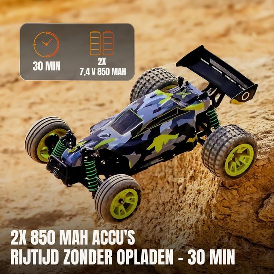 Met 2× 850 mAh accu’s geniet je tot wel 30 minuten onafgebroken speeltijd, zodat je langer kunt racen en minder hoeft te wachten. Deze RC truck is het perfecte cadeau voor kinderen die houden van snelheid, avontuur en buiten spelen. Elk moment met deze auto voelt als een echte race-ervaring vol energie en plezier.
