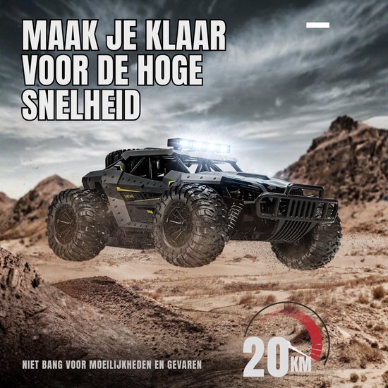 Deze 1:16 offroad RC auto is uitgerust met koplampen en chassisverlichting, waardoor je zelfs in het donker kunt blijven rijden. Dankzij het robuuste ontwerp en de sterke aandrijving rijdt deze all-terrain RC auto moeiteloos over zand, gras en ruwe ondergronden. De 2.4GHz afstandsbediening zorgt voor stabiele en storingsvrije controle. Zo voelt elke rit als een echte offroad race-ervaring.