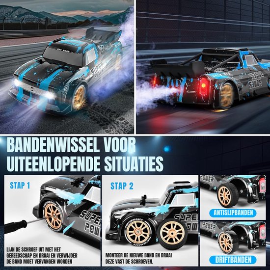 Deze RC drift car is gebouwd voor actie met een topsnelheid van 25 km/u. De ingebouwde LED verlichting en spray-effect zorgen voor een spectaculaire look, vooral in het donker. Elke rit wordt een show waarbij jij de hoofdrol speelt. Perfect voor iedereen die houdt van snelheid, stijl en aandacht.