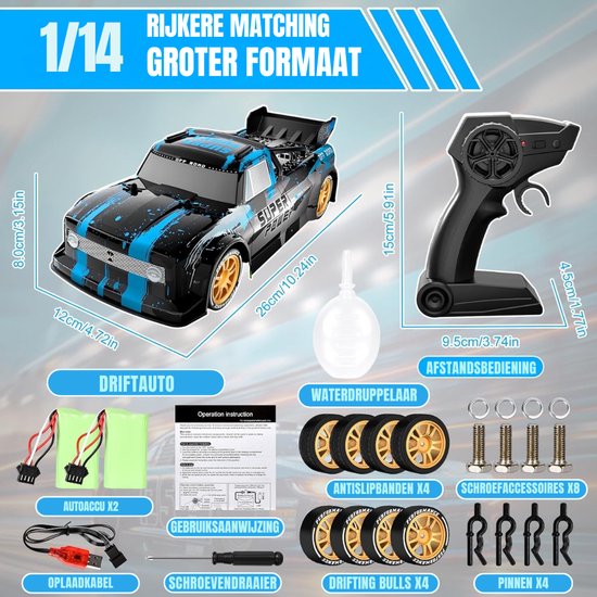 Grijp nu je kans! Ervaar zelf de kracht, snelheid en sensatie van deze RC drift car, Blauw/Zwart en profiteer vandaag nog van een exclusieve korting.