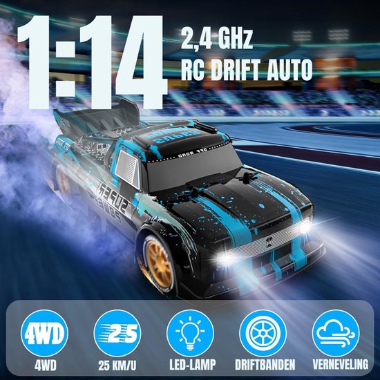 Ben je het zat dat RC auto’s traag, saai en zonder echte actie zijn? Met de RC drift car, Blauw/Zwart ervaar je pure snelheid, controle en adrenaline, waardoor elke rit voelt als een echte race-ervaring. Deze krachtige 1:14 4WD drift auto haalt snelheden tot 25 km/u en geeft je het gevoel dat jij de baas bent over elke bocht. Ontsnap aan verveling en beleef spanning, uitdaging en plezier in één.