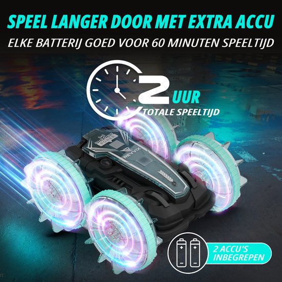 De Revvix RC bestuurbare auto combineert kracht, technologie en rijplezier in één opvallend ontwerp. Deze waterdichte offroad stuntwagen beschikt over dubbele bediening, twee accu’s en LED-verlichte wielen. Geschikt voor kinderen, tieners en volwassenen die houden van snelheid en avontuur op elk terrein.