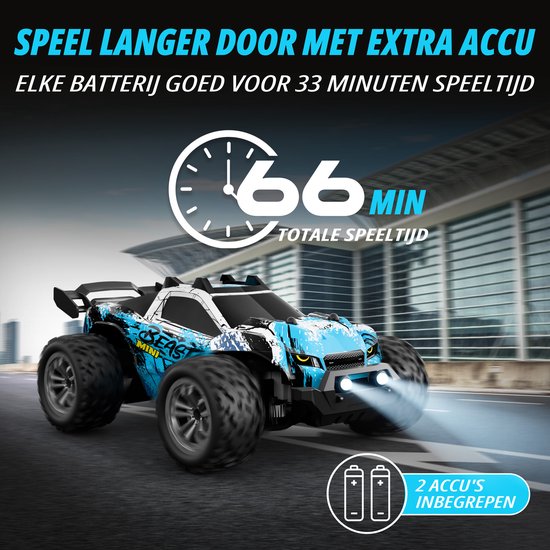 De Revvix bestuurbare auto is een krachtige RC auto voor buiten met 2 accu’s voor extra lang speelplezier. Deze afstandsbestuurbare auto is uitgevoerd als offroad monstertruck en biedt veel grip en controle op zand, gras, rotsen en hout. Dankzij de sterke motor, robuuste schokdempers en dubbele versnellingen rijdt hij stabiel op verschillende ondergronden.