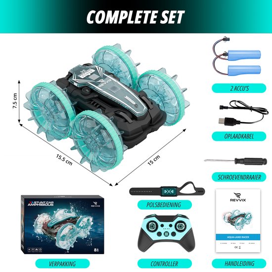 De Revvix bestuurbare auto is een krachtige RC auto voor buiten met 2 accu’s en waterdicht ontwerp. Deze afstandsbestuurbare auto is gemaakt voor offroad rijden en stunts op verschillende ondergronden. Dankzij de dubbele bediening, LED-verlichte wielen en robuuste bouw biedt hij veel grip, controle en speelplezier op elk terrein.