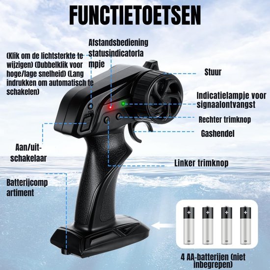 Betrouwbare Controle en VeiligheidDankzij de ingebouwde kantelbeveiliging hoef je je geen zorgen te maken over omvallen tijdens het varen. De stabiele besturing zorgt voor vertrouwen, zelfs bij hoge snelheid. Met de LED-verlichting blijft de boot goed zichtbaar, ook bij minder licht. Zo geniet je zorgeloos van elke race op het water.